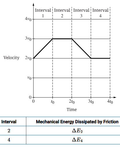 A block slides down an inclined plane whose roughness varies, but whose incline is constant. The graph shows the block’s velocity as a function of time. The table lists the mechanical energy dissipated by friction over intervals 2 and 4.