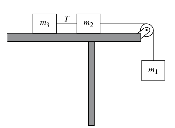 Three blocks of mass, m1, m2, and m3 are connected by strings as shown in the figure. When the system is released from rest, the blocks slide on the table. All frictional forces are negligible.