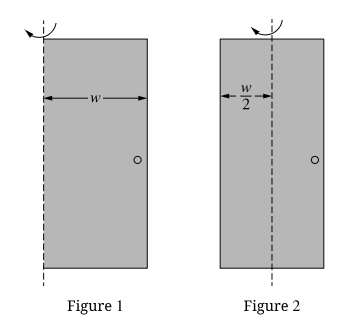 A uniform rectangular wooden door has a width w and mass m. When the door is opened, it rotates about an axis along its vertical edge, as shown in Figure 1, and has a rotational inertia of 13mw2.