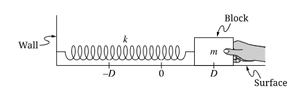 A block of mass m sits on a horizontal surface, where friction between the block and the surface is negligible. The block is attached to one end of an unstretched horizontal spring with spring constant k, and the other end of the spring is attached to a wall. The block is pulled to the right a distance D from equilibrium x=0 as shown in the figure. At time t=0 the block is released from rest.