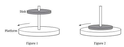 A horizontal platform is initially rotating about a vertical axis as shown in Figure 1. A stationary disk is dropped directly onto the center of the platform. A short time later, the disk and platform rotate together without slipping, as shown in Figure 2.