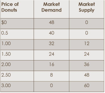 Consider the table below that shows the supply and demand for the donut market. How do you know what the equilibrium price of donuts is?