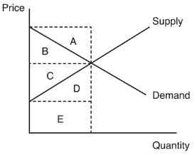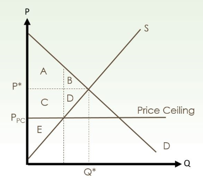 Consider the graph. Which area(s) represent(s) CONSUMER surplus after the price ceiling is imposed?