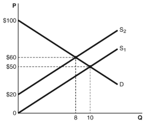 Based on the graph above, what is the total deadweight loss when a tax of $20 per unit is imposed on sellers?