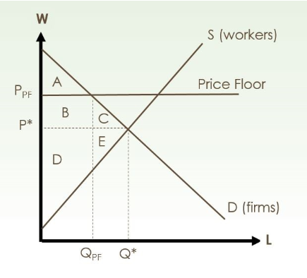 In our minimum wage example (a price floor), what happens to consumer surplus when the minimum wage is instituted? The figure below may help you answer this question.