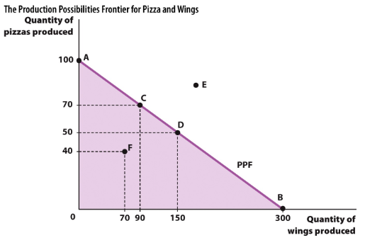 Based on the figure below, what would be the opportunity cost of producing 20 more pizzas (i.e. the number of wings that must be given up) if the economy is currently efficiently producing 150 wings and 50 pizzas?