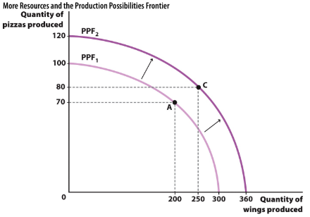 The graph below illustrates the effect on the production possibilities frontier if the population grows, making more workers available. This new production possibilities frontier reflects the ability of society to