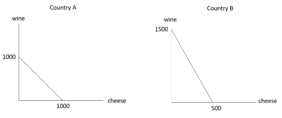 Country A has a comparative advantage in cheese; Country B has a comparative advantage in wine
