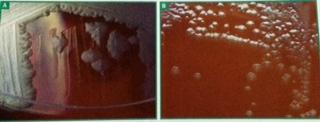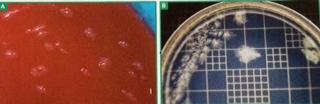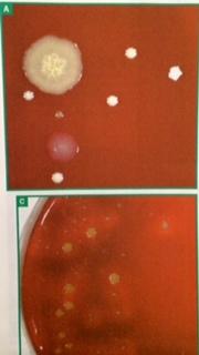 White growth on blood agar plate demonstrating B-hemolysis is characteristic of staph. In A) the agar is darkening from the hemolysis. In B) there is weak hemolysis.