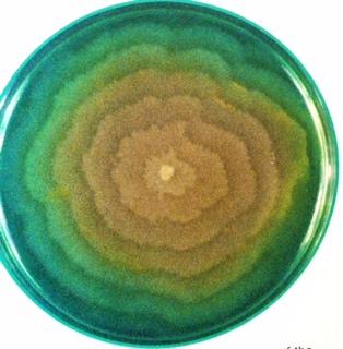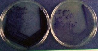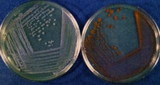 The influence of nutrient availability on pigment production. The nutrient agar (right) has less nutrients so less pigment.