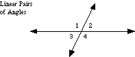 A pair of adjacent angles formed by intersecting lines. Angles 1 and 2 below are a linear pair. So are angles 2 and 4, angles 3 and 4, and angles 1 and 3. Linear pairs of angles are supplementary.