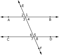 ngles 1 and 8 (and angles 2 and 7) are called alternate exterior angles. They’re on opposite sides of the transversal, and they’re outside the parallel lines.