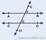 Transversal EFGH intersects lines AB and CD such that a pair of alternate E are equal.