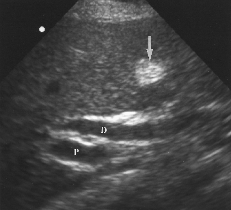 Name the abdominal organs in order from Hyperechoic to hypoechoic