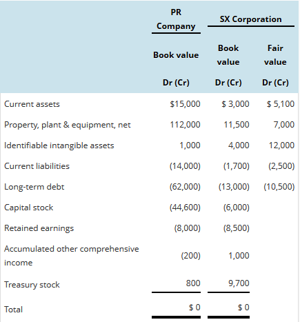 PR Company pays $15,000 in cash and issues stock with a fair value of $45,000 to acquire all of SX Corporation's stock. SX will be a subsidiary of PR. Balance sheet accounts just prior to the acquisition are as follows, in trial balance format: