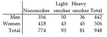 If two different people are randomly selected from the 948 subjects, find the probability that they are both heavy smokers. Round to six decimal places.