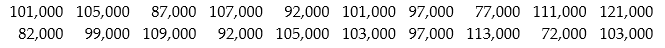 The data set represents the income levels of the members of a country club. Find the probability that a randomly selected member earns at least $97,000. Round your answers to the nearest tenth.