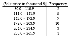 The frequency distribution above summarizes the home sale prices in the city of Summerhill for the month of June. Determine the width of each class.