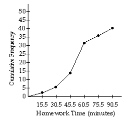 The table contains data from a study of daily study time for 40 students from Statistics 101. Construct an ogive from the data.