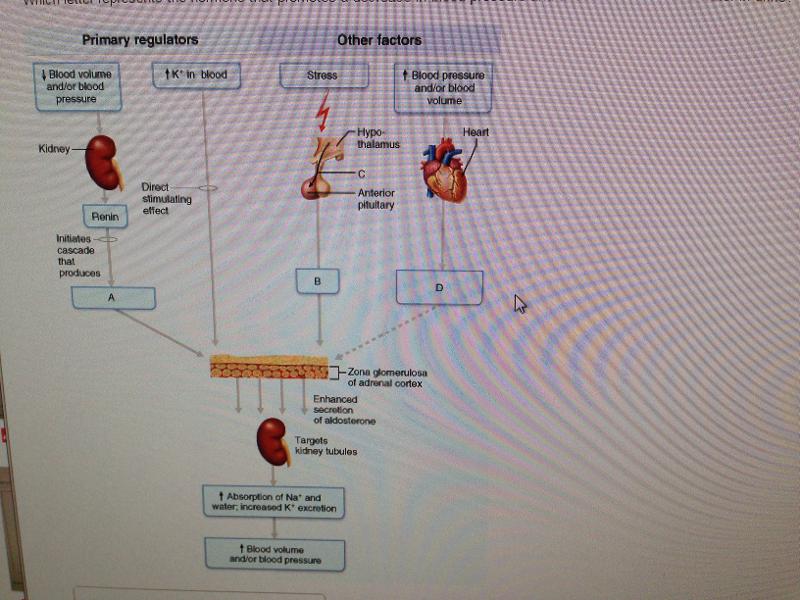 Which letter represents the hormone that promotes a decrease in blood pressure and a loss of sodium and water in urine?