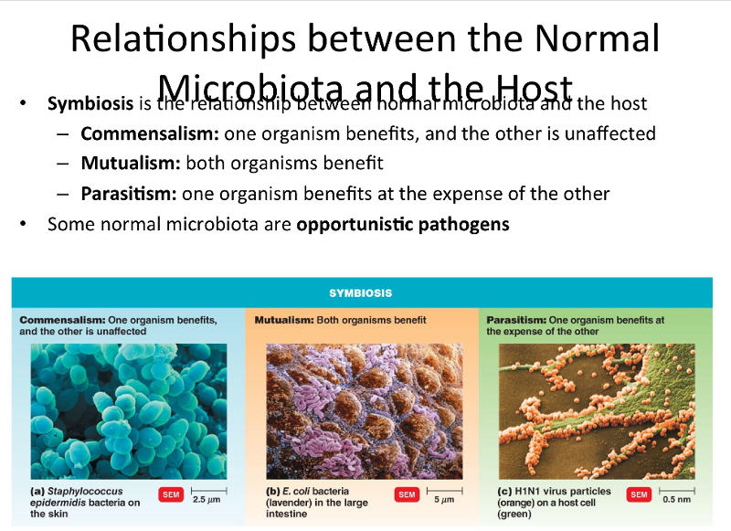 Symbiosis is the relationship between normal microbiota and the host, a relationship between 2 organisms in which at least one organism is dependent on the other. Some normal microbiota are opportunistic pathogens. pg 392
