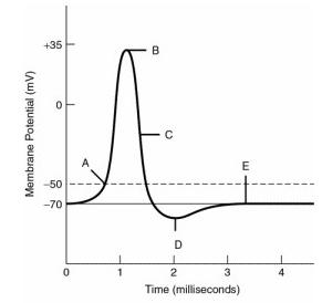 The minimum graded depolarization needed to operate the voltage-gated sodium channels is indicated by the label