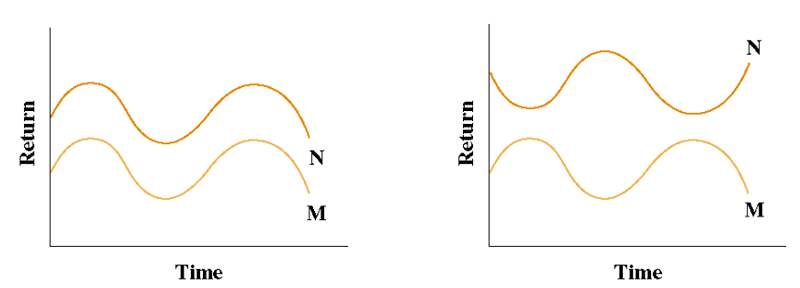 Left graph - perfectly positively correlated returns (p = +1)
