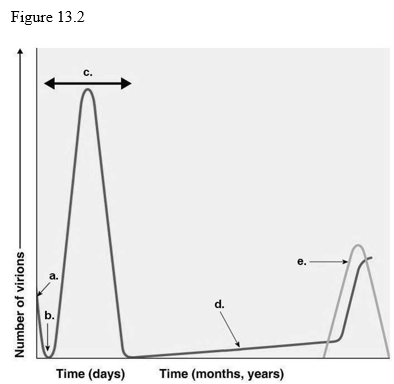 36) Assume a patient had chickenpox (human herpesvirus 3) as a child. Which line on the graph in Figure 13.2 would show the number of viruses present in this person as a 60-year-old with shingles (human herpesvirus 3)?
