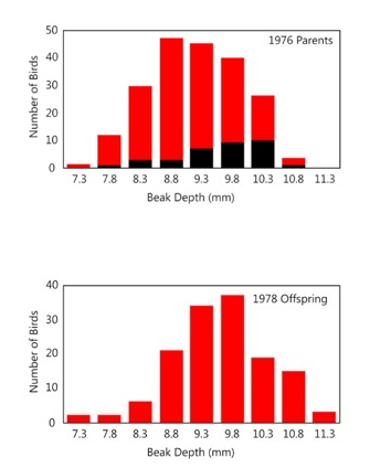 The top figure shows beak sizes of the 1976 finch population before the drought of 1977 (red bars) and after the drought (black bars). The lower figure shows the beak sizes of the offspring of the drought survivors in 1978. What do these figures tell us?