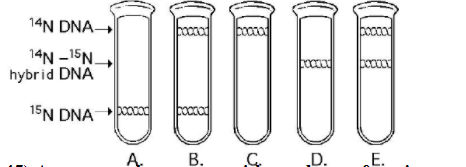 45) A space probe returns with a culture of a microorganism found on a distant planet. Analysis shows that it is a carbon-based life-form that has DNA. You grow the cells in ¹⁵Nmedium for several generations and then transfer them to ¹⁴N medium. Which pattern in the figure above would you expect if the DNA was replicated in a conservative manner? A) A B) B C) C D) D E) E