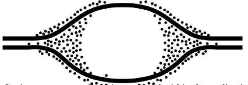 47) In an experiment, DNA is allowed to replicate in an environment with all necessaryenzymes, dATP, dCTP, dGTP, and radioactively labeled dTTP (³H thymidine) for severalminutes and then switched to nonradioactive medium. It is then viewed by electronmicroscopy and autoradiography. The figure above represents the results. Which of the following is the most likely interpretation?