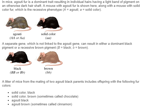 In mice, agouti fur is a dominant trait resulting in individual hairs having a light band of pigment on an otherwise dark hair shaft. A mouse with agouti fur is shown here, along with a mouse with solid color fur, which is the recessive phenotype (A = agouti; a = solid color).