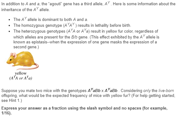 Suppose you mate two mice with the genotypes AYaBb x AYaBb . Considering only the live-bornoffspring, what would be the expected frequency of mice with yellow fur? (For help getting started, see Hint 1.)