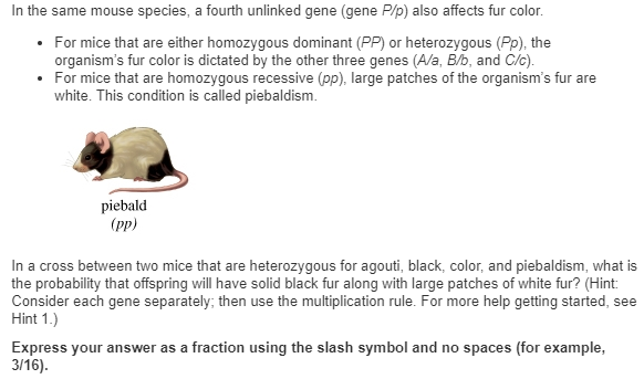 In a cross between two mice that are heterozygous for agouti, black, color, and piebaldism, what is the probability that offspring will have solid black fur along with large patches of white fur? (Hint: Consider each gene separately; then use the multiplication rule. For more help getting started, see Hint 1.)
