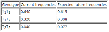 You observe a herd of Banthas in the desert of Tatooine. Their tail length is controlled by a single gene where dominant T1 allele and recessive T2 allele code for long and short tail, respectively. Table below shows the current and expected future genotype frequencies in this population: