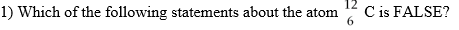 front 1 A) It has 6 protons in its nucleus. B) It has 12 neutrons in its nucleus. C) It has 6 electrons orbiting the nucleus. D) Its atomic number is 6. E) Its atomic weight is 12. | back 1 Answer: B |