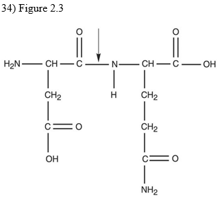 front 34 What kind of bond is at the arrow in Figure 2.3? A) disulfide bridge B) double covalent bond C) hydrogen bond D) ionic bond E) peptide bond | back 34 Answer: E |