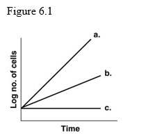 front 3 3) In Figure 6.1, which line shows the growth of an obligate aerobe incubated anaerobically? A) a B) b C) c | back 3 Answer: C |