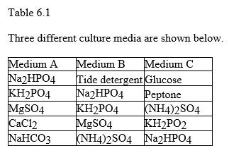 front 37 37) For the three types of media in Table 6.1, which medium (or media) is/are chemically defined? A) A B) B C) C D) A and B E) A and C | back 37 Answer: A |