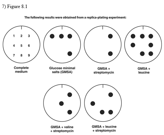 front 7 In Figure 8.1, which colonies are streptomycin-resistant and leucine-requiring? A) 1, 2, 3, and 9 B) 3 and 9 C) 4, 6, and 8 D) 4 and 8 E) 5 and 6 | back 7 Answer: D |