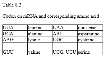 front 23 23) Refer to Table 8.2 The anticodon for valine is A) GUU. B) CUU. C) CTT. D) CAA. E) GTA. | back 23 Answer: D |