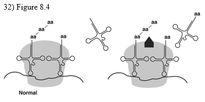 front 32 In Figure 8.4, the antibiotic chloramphenicol binds the 50S large subunit of a ribosome as shown (the light gray area is the large subunit, while the black shape is the drug). From this information you can conclude that chloramphenicol A) prevents transcription in eukaryotes. B) prevents translation in eukaryotes. C) prevents transcription in prokaryotes. D) prevents translation in prokaryotes. E) prevents mRNA-ribosome binding. | back 32 Answer: D |